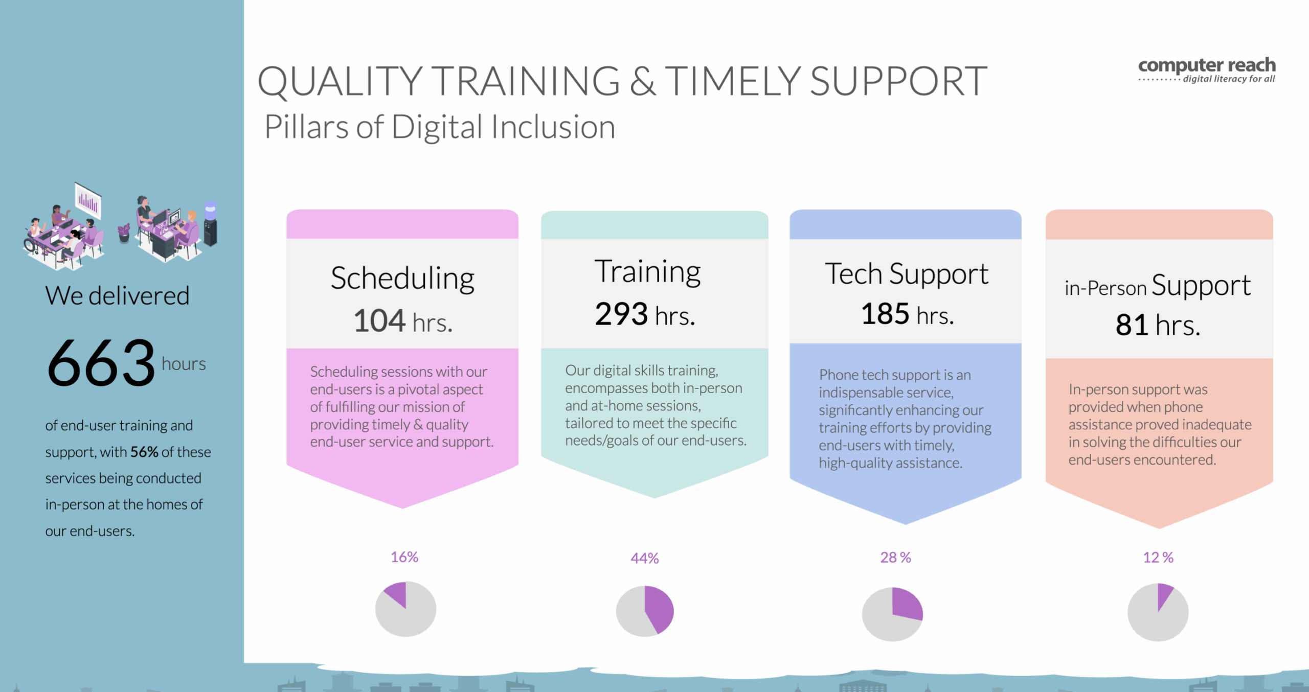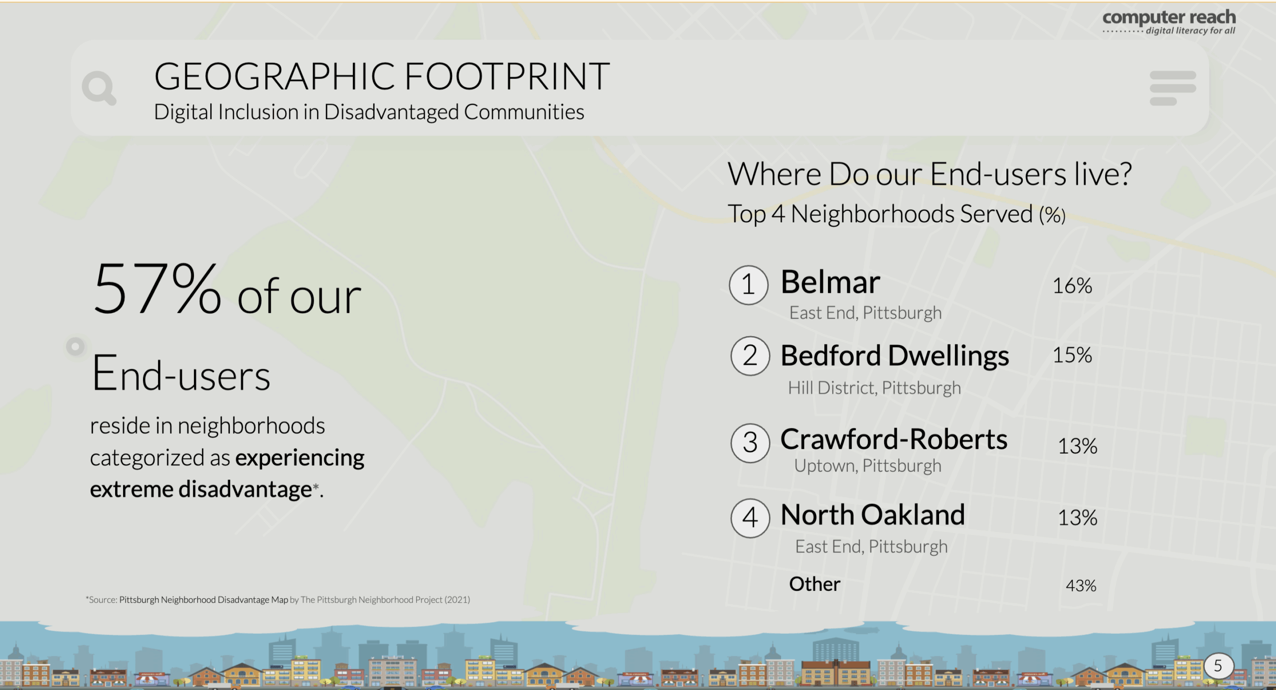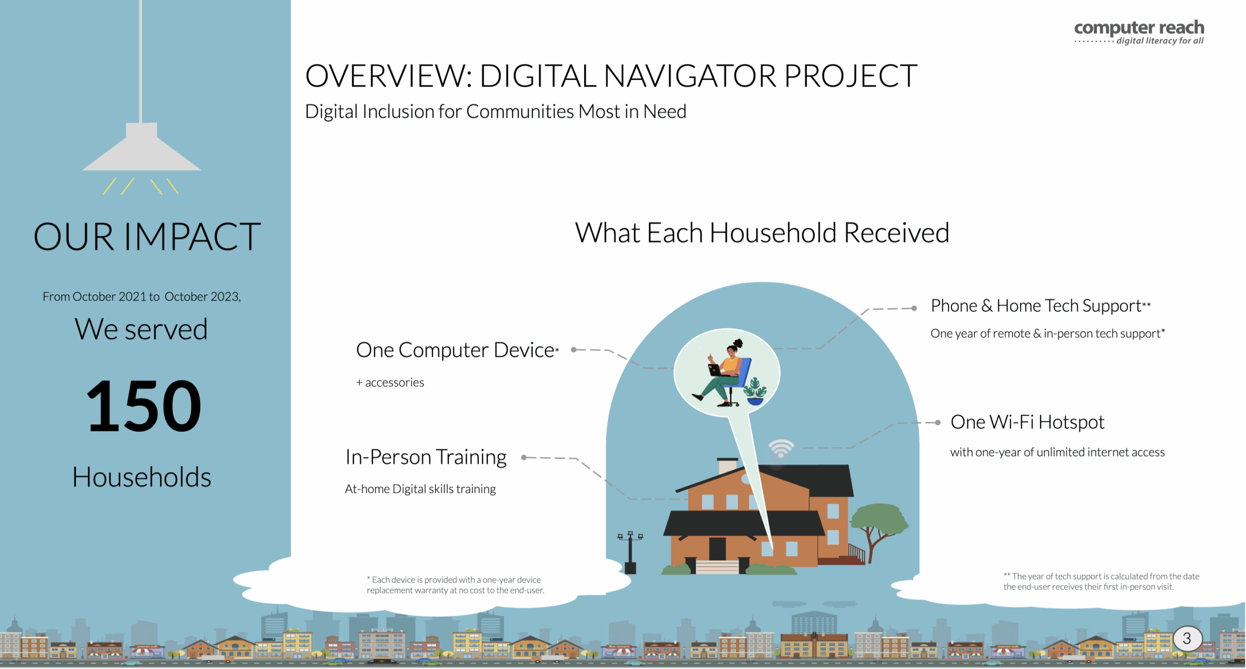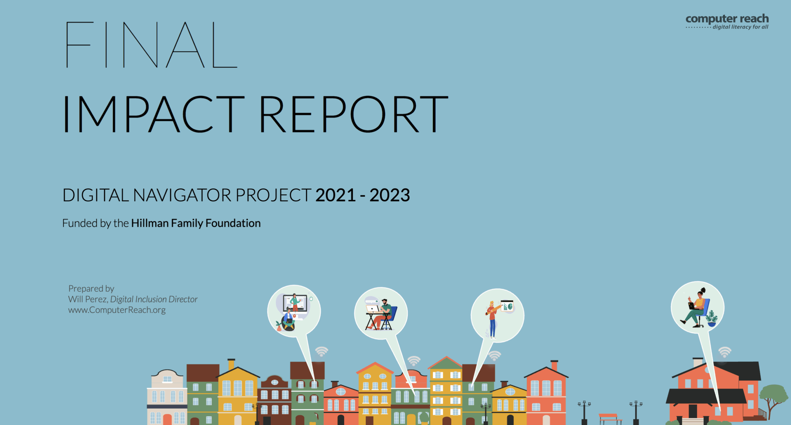 Our 2021-2023 Impact Report showcases the Computer Reach launch of our Digital Navigator program in coordination with the National Digital Inclusion Alliance. We utilized a Hillman Family Foundation grant to improve the lives of several Pittsburgh area communities that struggle to afford food, medicine and rent ... let alone any computers or training. We provided refurbished computers at no cost to homes, schools, libraries, and workplaces. Our in-person and remote computer hardware and software support empowered individuals to meet their unique technology needs. We trained families on healthcare, job searches, schoolwork, banking, shopping, social media safety and many more tech needs based on their specific requests.