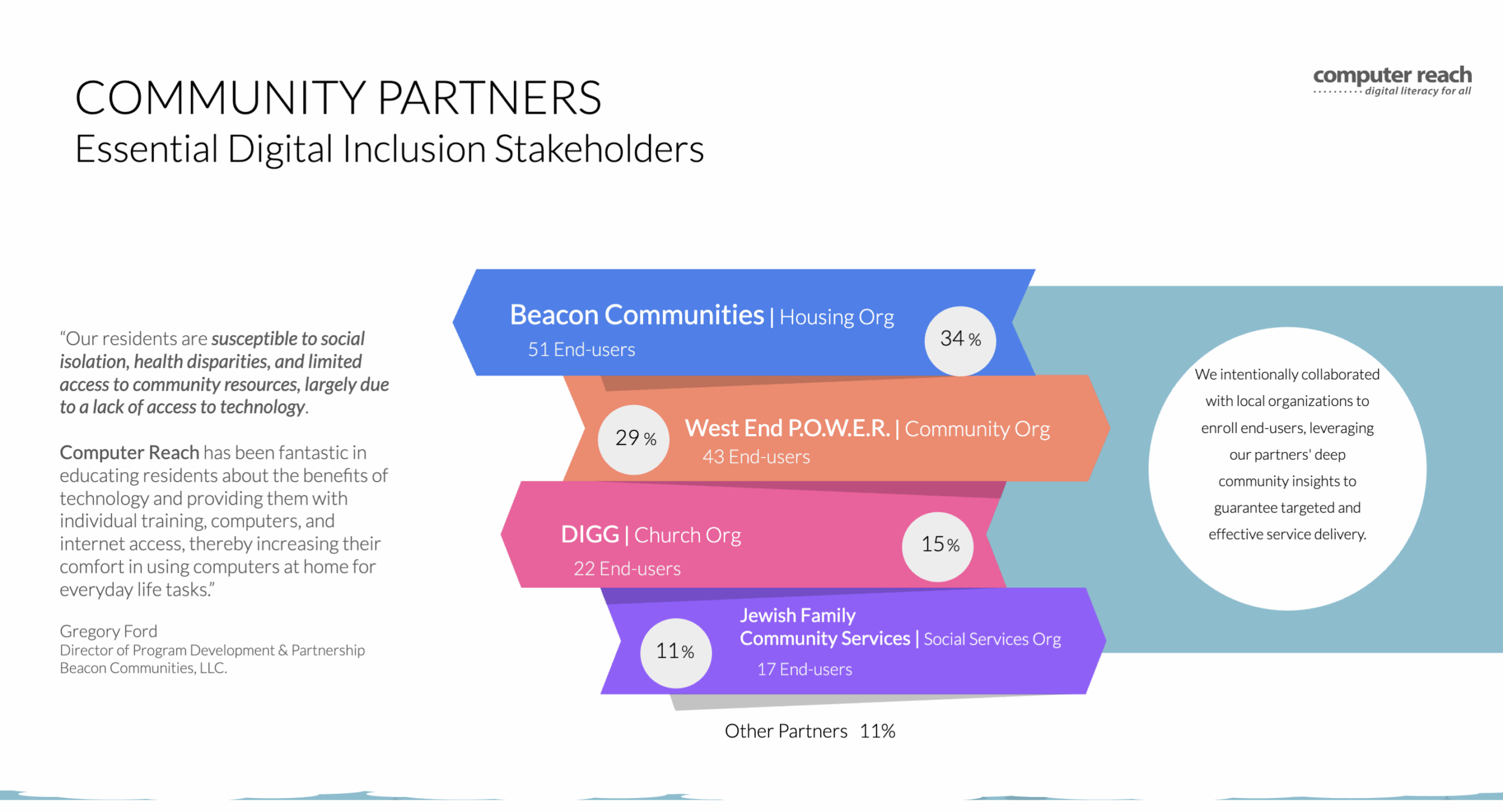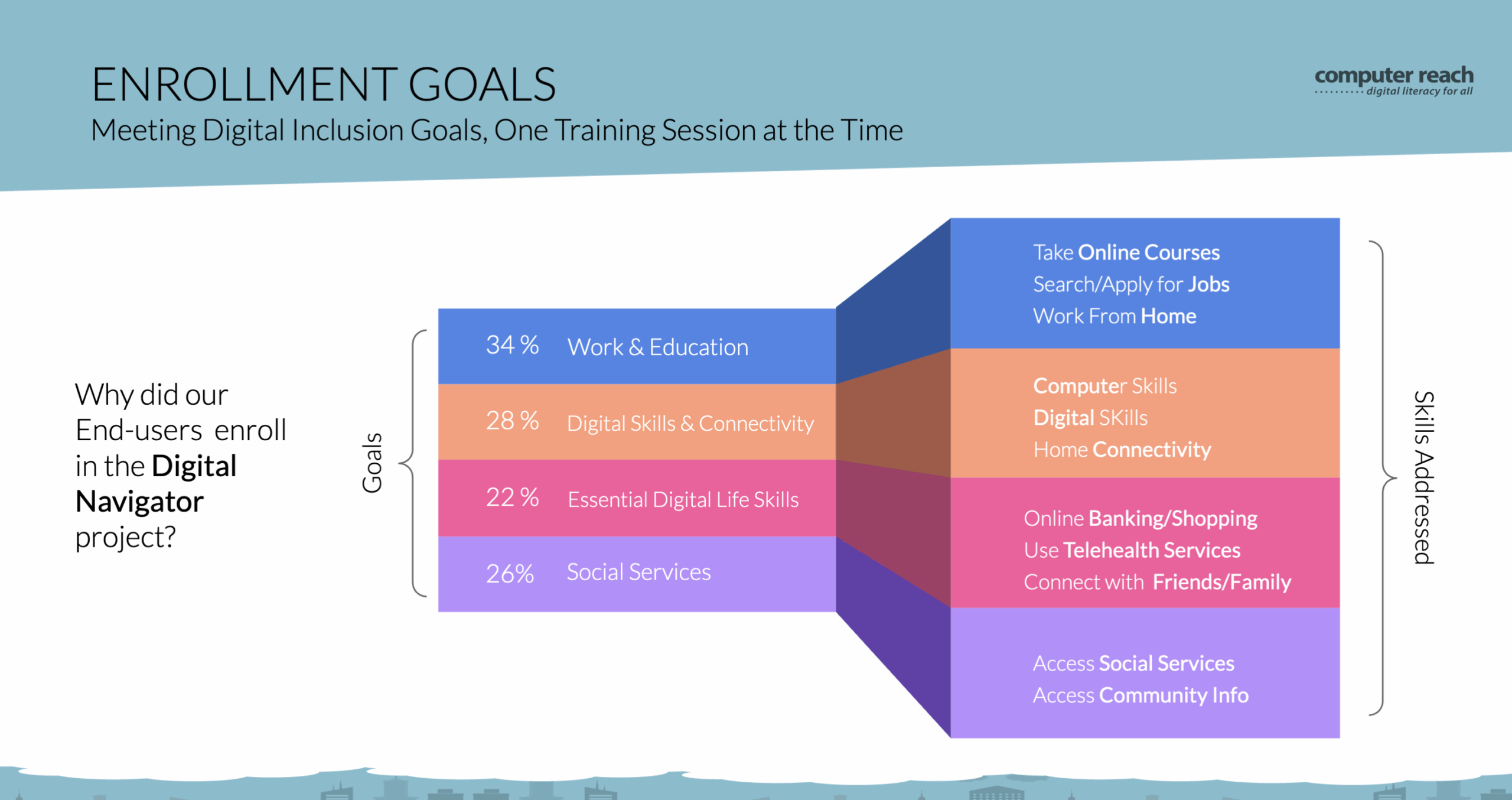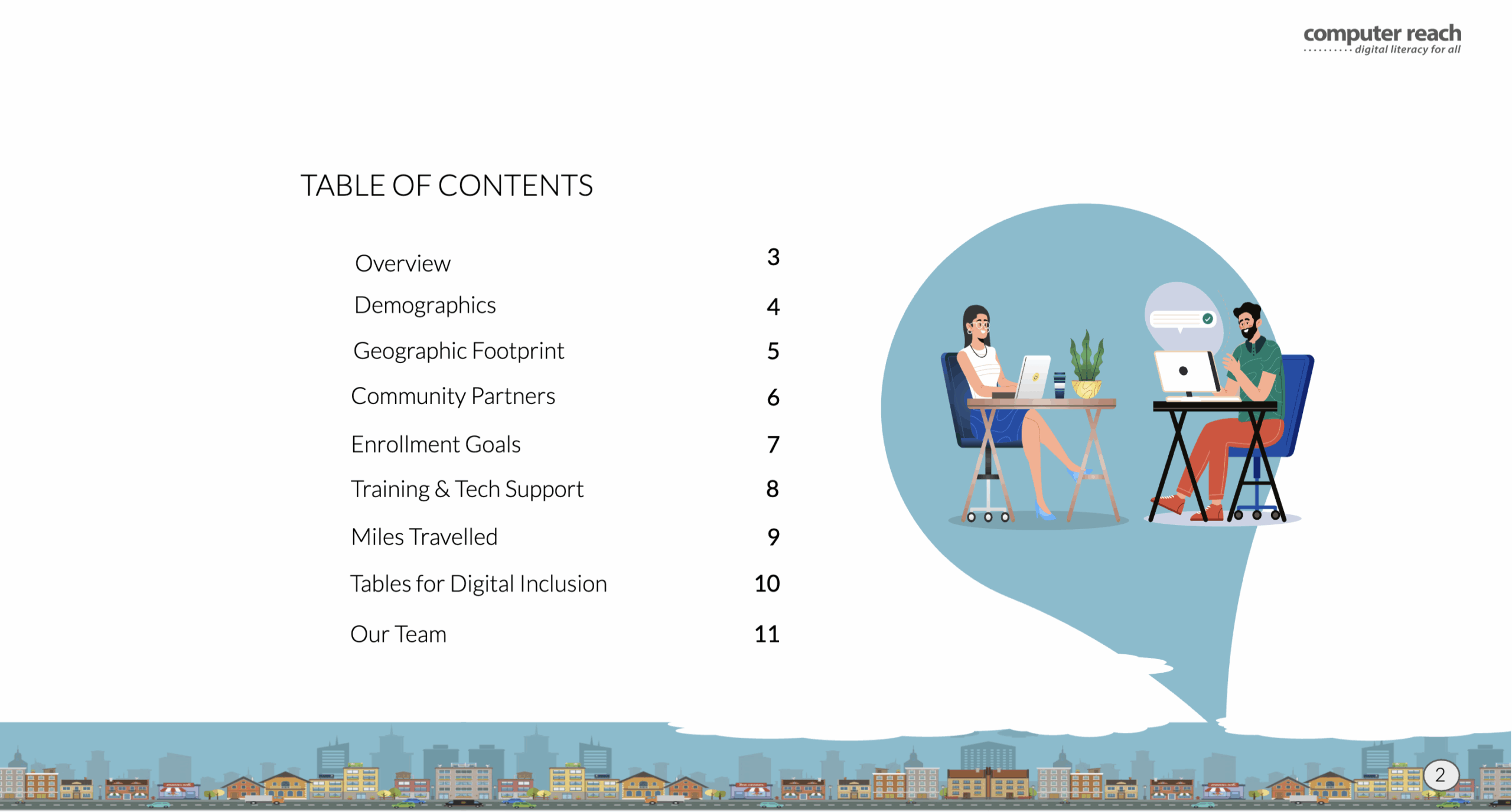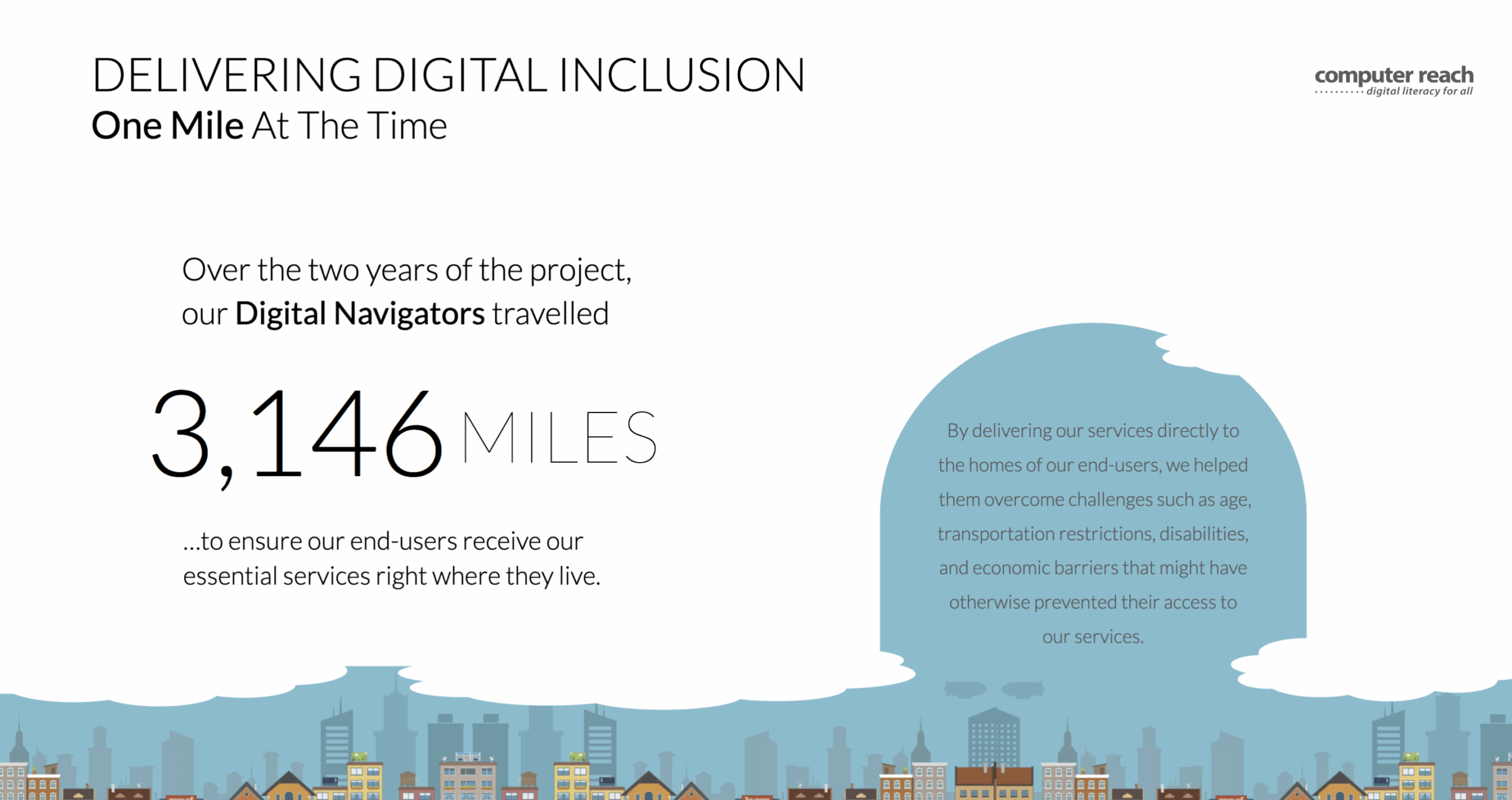 Our 2021-2023 Impact Report showcases the Computer Reach launch of our Digital Navigator program in coordination with the National Digital Inclusion Alliance. We utilized a Hillman Family Foundation grant to improve the lives of several Pittsburgh area communities that struggle to afford food, medicine and rent ... let alone any computers or training. We provided refurbished computers at no cost to homes, schools, libraries, and workplaces. Our in-person and remote computer hardware and software support empowered individuals to meet their unique technology needs. We trained families on healthcare, job searches, schoolwork, banking, shopping, social media safety and many more tech needs based on their specific requests.